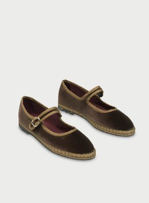 Mary Jane en velours marron foncé avec passepoil marron clair et fermeture à boucle.