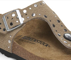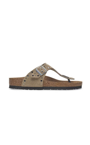 Modèle devenu culte, les Gizeh de BIRKENSTOCK sont des sandales polyvalentes qui ne manquent pas de style. Notre élégant modèle à entre-doigt affiche un design minimaliste et tendance, tout en offrant un maintien parfait. La présente variante arbore des rivets placés solidement et avec précision. Sans embout, ils ne pénètrent le cuir qu’en surface. Grâce à ce processus de fabrication complexe, le port de la chaussure reste optimal. Un détail qui fait toute la différence ! La tige est confectionnée dans un cuir velours particulièrement doux qui drape le pied comme une seconde peau.