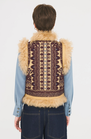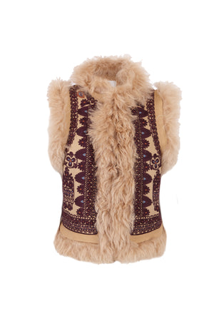 Gilet brodé sans manches d'inspiration afghane. Broderies florales artisanales sur l'ensemble du gilet. Finitions en fourrure d'agneau ton sur ton. Doublure en fausse fourrure ultra-douce. Fermeture crochets.