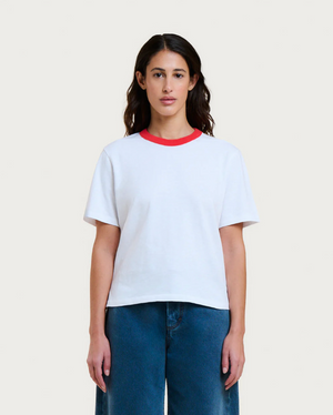 Le t-shirt Billie blanc Homecore revisite un classique avec des détails distinctifs. Son coloris blanc lumineux est relevé par un col rouge contrasté, tandis que la ligne rouge au dos, signature emblématique Homecore, apporte une touche graphique et moderne.
