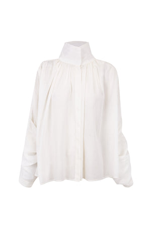 Blouse en voile de coton. Coupe ample. Manches ballon froncées. Double ganse à la couture. Col montant. Patte de boutonnage dissimulée qui permet de porter la blouse ouverte.