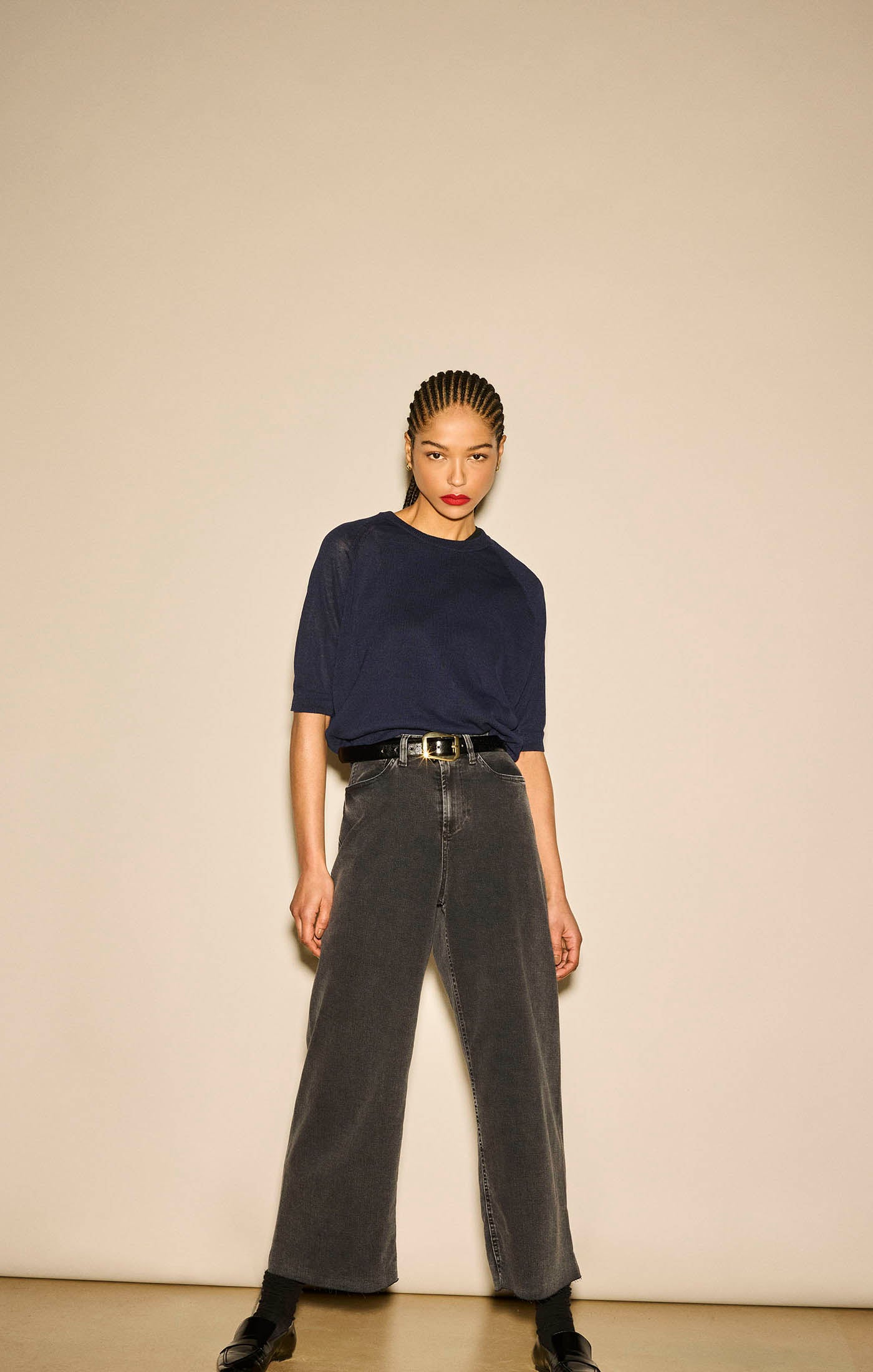 Un jean large taille haute en denim anthracite, à la coupe fluide et structurée, qui allonge la silhouette avec élégance