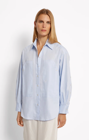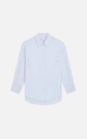 Le modèle ANGELE en bleu est un iconique du vestiaire Roseanna. Une chemise à la coupe droite dont la singularité repose sur ses grandes poches plaquées devant ainsi que sur ses manches que l'on peut boutonner ou déboutonner à l'envie jusqu'au milieu du bras.