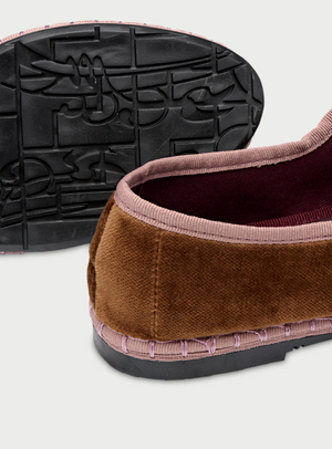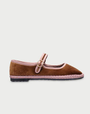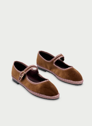 Mary Jane en velours marron avec passepoil rose pâle et fermeture à boucle.