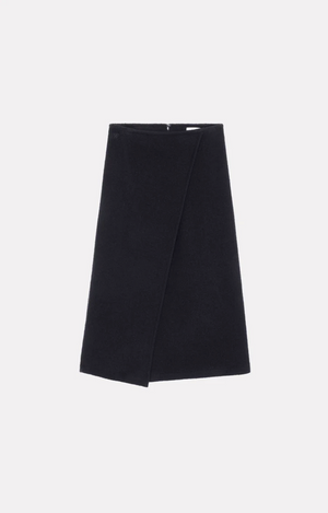 Jupe en jersey de laine à la coupe droite effet portefeuille, longueur midi, taille haute, avec une fermeture éclair à l’arrière.