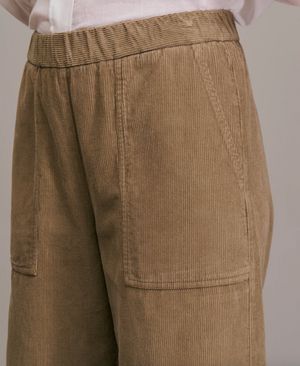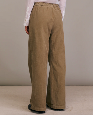 Pantalon en lin aux jambes fluides et évasées et large ceinture élastiquée.
