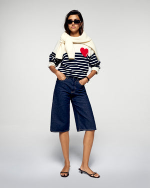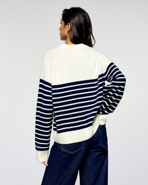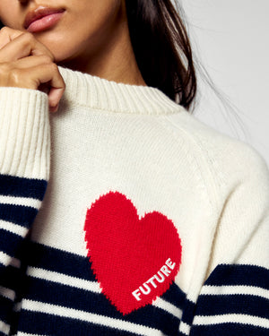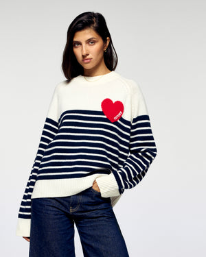 Pull Col Rond Rayé Coeur - Écru et Bleu