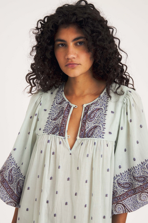 Robe longue en voile de coton tissé artisanalement, aux teintes lumineuses, ornée d’un motif cachemire. Elle présente des manches bouffantes et un volant en bas de robe. La pièce est doublée pour plus de confort. Le motif cachemire est dessiné dans notre studio parisien puis réalisé de façon artisanale en Inde, selon un savoir-faire textile traditionnel.