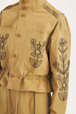 Blouson en popeline de coton à l’allure utilitaire, sublimé par des broderies florales d’inspiration mexicaine placées sur les poches et les manches. Sa coupe oversize structurée est complétée par de larges poches plaquées brodées sur le devant. Le col montant boutonné apporte du caractère, tandis qu’un lien de serrage à la taille permet d’ajuster la silhouette.