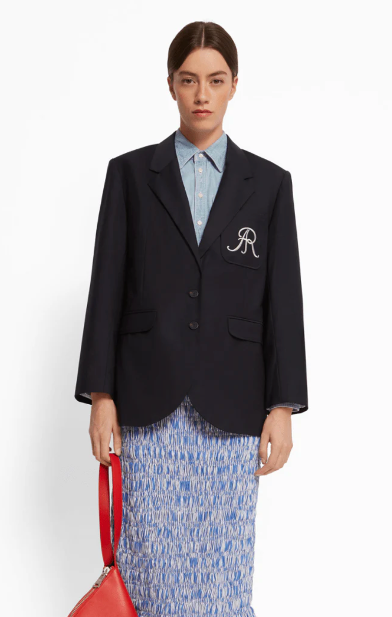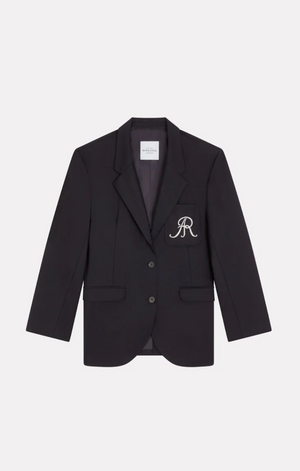 Veste tailleur à coupe droite, deux boutons devant, une poche poitrine plaquée avec broderie AR fil Blanc ainsi que deux poches à rabat.