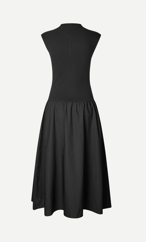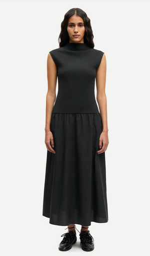 Robe maxi sans manches en jersey et tissu tissé, avec une coupe ajustée et une jupe évasée. Col montant, dos droit. Matière principale en coton biologique et en mélange de coton biologique extensible.