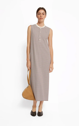 Cette robe longue sans manches présente une coupe droite, un col rond, une patte de boutonnage milieu devant fermé par des boutons ainsi que des fentes latérales.