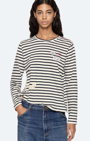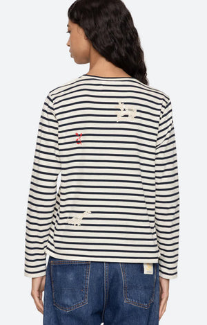 Le t-shirt à manches longues Athena est une pièce à la fois ludique et raffinée, avec de délicats détails en dentelle appliquée, des étiquettes personnalisées « Sea » et un motif à rayures classique, pour un style vintage et intemporel.