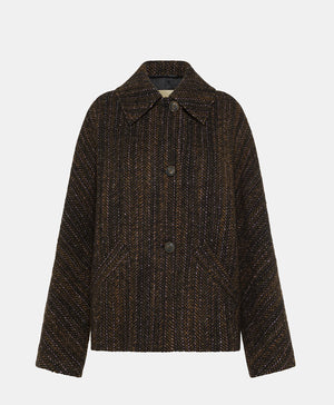 Manteau court caban à simple boutonnage en maxi chevron de laine bouclée. Lord, dans son tissu doux, combine des détails cocoon, comme une ligne légèrement en œuf et des manches kimono arrondies, avec des accents masculins, comme un sous-col et des revers au bas des manches en melton. Poches passepoilées et boutons en corne.