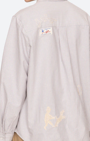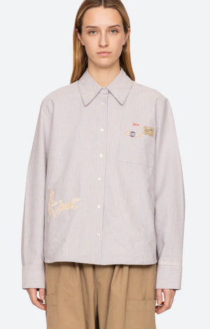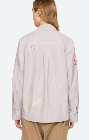 La chemise Lavinia se distingue par ses étiquettes personnalisées « Sea », ses motifs délicats en dentelle appliquée et sa broderie soignée. Le tissu à rayures raffiné apporte une touche de sophistication intemporelle.