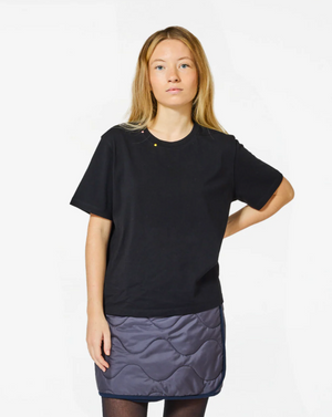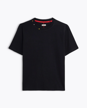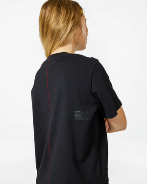 Le Blake se décline en noir, un t-shirt à manches courtes au design minimaliste. Avec sa coupe oversize et son détail décoratif au col, il offre un style moderne et décontracté. Dans le dos, une couture rouge verticale signature et une définition HOMECORE imprimée ajoutent une touche identitaire forte.