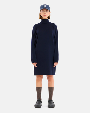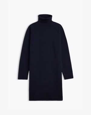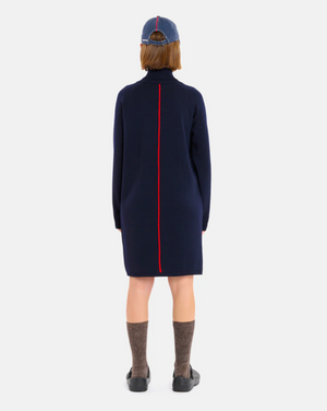 Cette robe à col roulé en maille côtelée incarne l’équilibre parfait entre confort et sophistication. Sa silhouette ajustée suit naturellement les lignes du corps, tandis que son col montant souligne l’élégance du port de tête. Les finitions côtelées au col, aux manches et à la base renforcent son look épuré, et la ligne rouge au dos vient signer la pièce avec subtilité.
