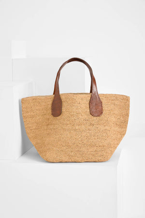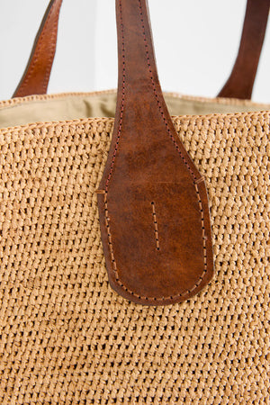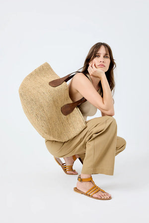 100% en Raphia naturel, ce sac doublé en coton bio allie souplesse et solidité d’une matière naturelle et durable. Les deux poignées sont en cuir de zébu tanné selon un procédé végétal.