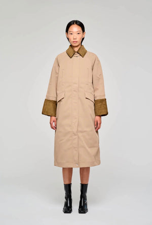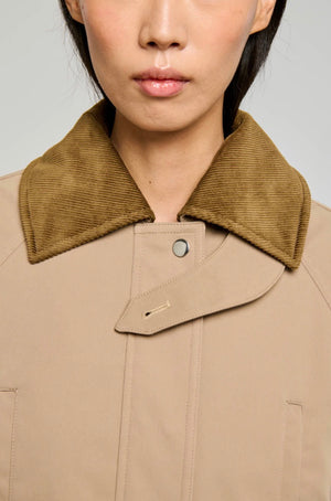 Manteau caractérisée par un col en velours côtelé et des poches frontales.