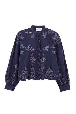 Blouse en coton denim et lin. Blouse entièrement brodée artisanalement. Découpe ondulée. Col mao boutonné.